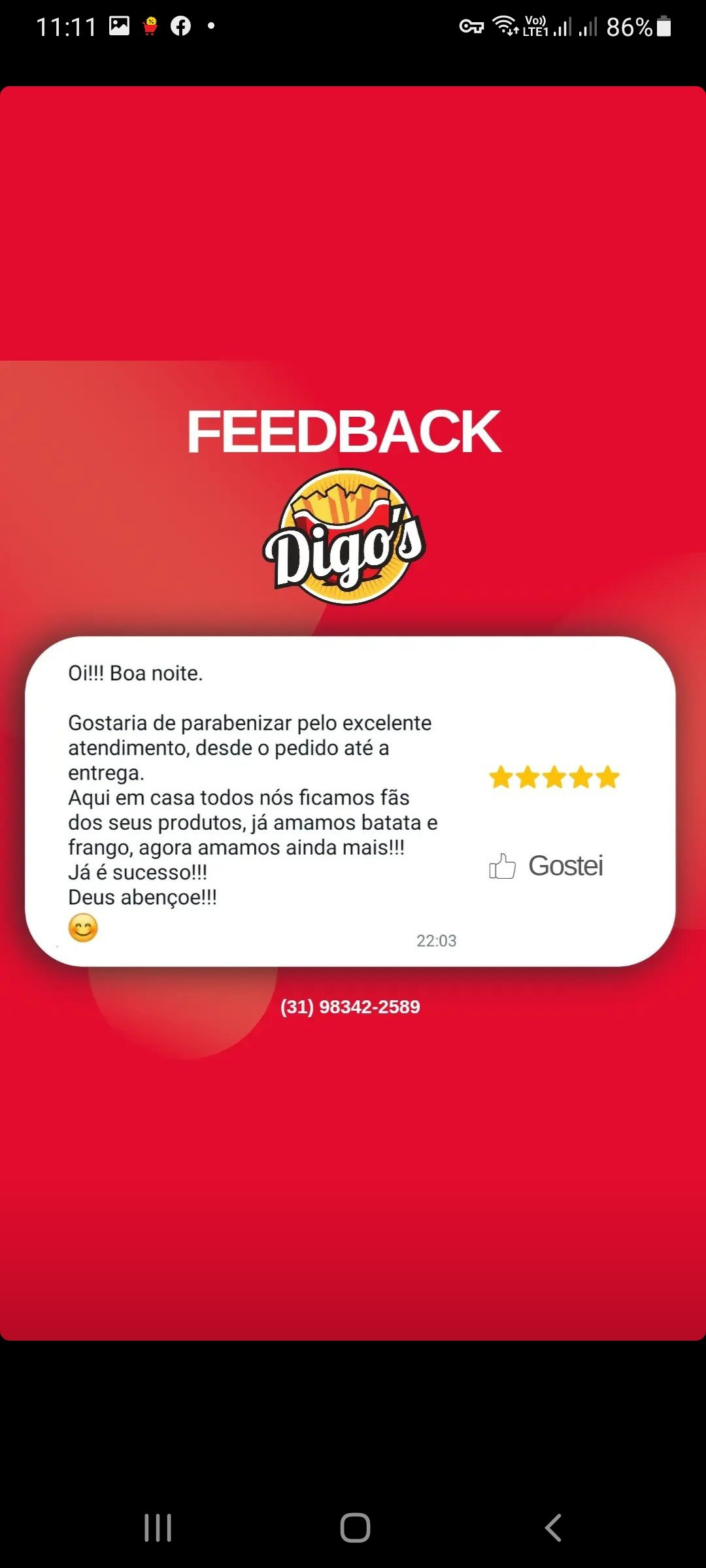 A batata Digo's recheada é uma massa de batata feita com a receita exclusiva nossa , recheada e feito em formato de discos, super crocante por fora e derrete na boca